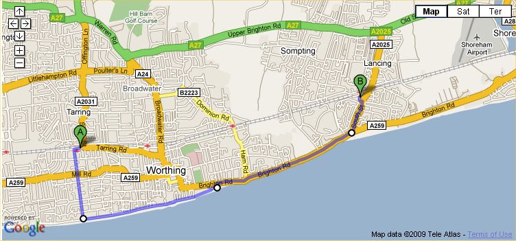 | 07:18 BST It's a rather splendid morning ! The sky is blue, the sun is shining, and there is hardly any breeze. Those are the exact same words I used yesterday, and like yesterday it is another chilly morning. Unlike yesterday I haven't actually been outside to experience the chilliness because I am on holiday from work today. My impression so far is that it is even chillier than yesterday. In another couple of hours, once the sun has climbed higher in the sky, it will begin to warm up, but maybe not as high as yesterday. At this time of year we are loosing too much heat to the cold night sky for the days to get very warm. This is particularly so right now after we have had a couple of clear nights. The universe just sucks the heat away from the Earth (what a mean bastard !). London will struggle to reach 20° C, and if I get to the south coast today the best I can hope for is 18° C. However, walking along the south coast means that the sun will be unobstructed, and if the day is as cloudless as forecast, the sun should feel delightfully warm. At this time I am still unsure if I am going out today. I feel a bit creaky right now, and my right leg seems to be particularly stiff. I'm also feeling like I want to go back to bed, and this could actually be a good idea. Although I normally try and get out as early as possible, it would probably do no harm to let the day warm up a bit before venturing out. On a more positive note, I did manage to curb my enthusiasm for eating last night, and I don't feel too bloated and uncomfortable to go on a long walk today. At least I think I am OK for that. If I do get out today, this is the route I propose to walk (except that I will use the beach and not the road) :- |