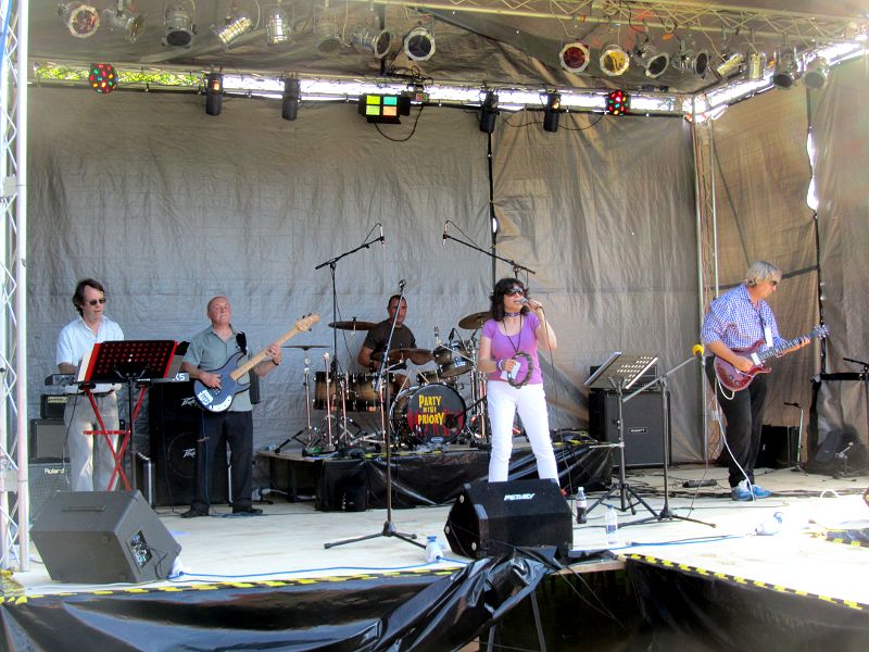 | 15:21 BST The weather was really good yesterday. It was bright and sunny, but a nice breeze stopped it getting too hot. Unfortunately that breeze didn't extend into my bedroom where it seemed exceptionally hot and stuffy all night. This morning it was 22° C by 9am, and since then it has risen to 27° C. A mixture of sunshine, and hazy sunshine has kept it bright all day. There seems more cloud than there was earlier, and maybe the clouds will brew up into thunderclouds just in time for the end of the olympic games (tee hee !). Apparently tomorrow could see some showers, but it will probably stay quite warm. Yesterday was amazing ! My train arrived at West Wickham station a couple of minutes later than it's correct time of 12:22, but that was of no consequence. Jo and Chris were waiting for me in the "tour bus" ready to go to Highams farm for the Highams Festival. When we were arrived at the gates we were presented with our VIP wrist band passes. It felt a great privilege to get one so I tried a bit harder to be useful at some light roadie duties (including drinking free beer), and being official band photographer :-) ![]() I