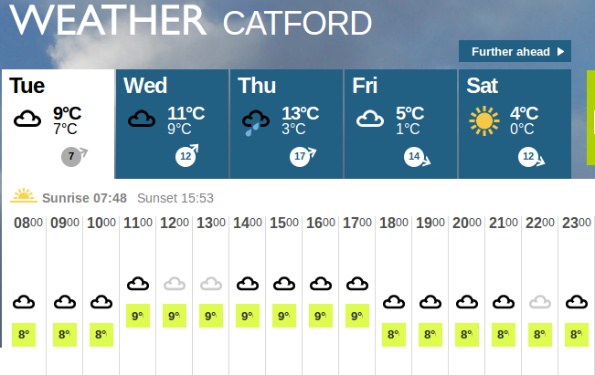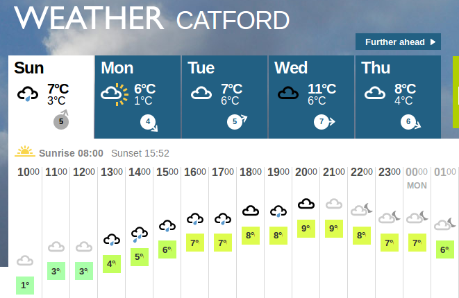 GMT Yesterday's sunshine was very welcome, but it still felt very chilly because of the wind...or maybe it was just me. It certainly didn't inspire me to go out apart from to the local shops. I think the sky clouded over before sunset, but the rain that was due to start falling soon after sunset, started a bit later, although I am not sure when. That rain is still falling this morning. ![]() It is truly dreadful