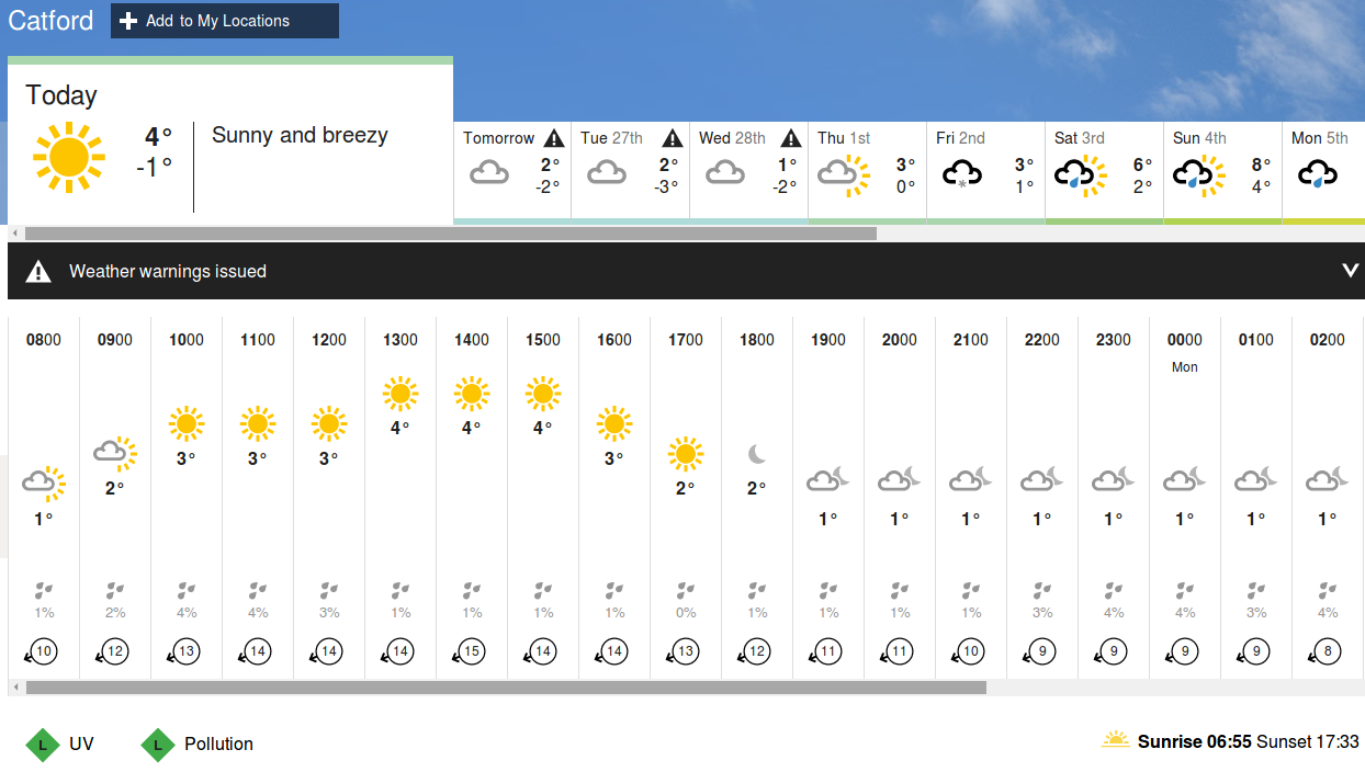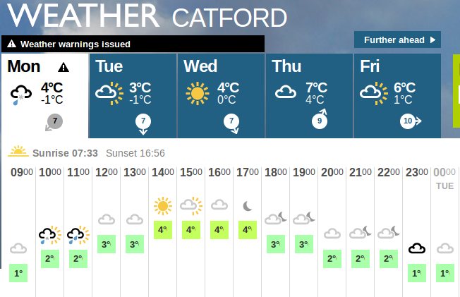 GMT It was certainly very dull yesterday, but fortunately it didn't rain much. The forecast included a little raindrop symbol for every hour, but then admitted there was only about a 25% chance of rain for almost all the day. After 8am, when it did rain, there was just one or two very light showers that I was aware of. While the damp and grey skies were nasty, the temperature was quite benign. The forecast said it would peak at 10° C after 5pm, and I think it reached that before then, and then went on to rise to a gnat's whisker short of 11° C, ![]() It looks like today will be