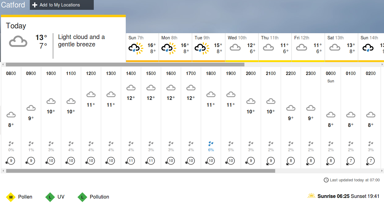 BST Yesterday's forecast persisted in saying it would be cloudy yesterday. I suppose that was mostly true if you include hours when the cloud was just very thin and patchy. The reality was that yesterday was far sunnier than the forecast said it would be. By 4pm, when the forecast said the first sunny periods should start, the sky was almost clear and blue, and it stayed that way until sunset. Unfortunately all that extra sunshine could not cope with a rather cool breeze coming in from the east. The afternoon high may have been the forecast 11° C, but it felt quite a bit cooler when the wond was blowing. ![]() The latest revision to today's forecast has not changed anything since the earlier one in the screenshot above. So far it has proved to be about right. The sky is rather cloudy, but with a few gaps here and there that have let in some hazy sunshine now and then. If the forecast is correct we will soon lose those, and the rest of the day is going to be rather dull and grey. It is also going to be a rather cool day. The predicted temperature of just 3° C at 7am was about right, and I expect the prediction of just 9° C this afternoon will correct too. The wind is still coming from the east, and so that will make it feel cooler still. At least it will be dry all day. Tomorrow will have a very similar range of temperature, but some sunny intervals are predicted, although there may be a splash of rain at 3pm. One thing I did do yesterday was to limit what I ate before going out. I wasn't feeling all that good yesterday, and I didn't want to feel sluggish when I walked to the station. I ate little more than a light lunch. I have to confess that while the 4 rice cakes I had were the start of a very light meal, the pepperoni and mozzarella cheese (conveniently pre-sliced to about the right size for the rice cakes) on each rice cake did make it rather less light. The basic principle did work though, and I did not feel sluggish walking to the station. Instead I had another reason to make it a less than pleasant walk. I think it was yesterday morning that I said I thought I had probably got a chest infection. During the day it was at most a minor inconvenience, but it did make breathing a bit harder as I walked to the station. It was all a bit peculiar... I allowed myself a bit of extra time to walk to the station, and I did think I was walking slower to avoid taxing my breathing. That worked in so much as I wasn't short of breath when I arrived on the platform, but I was a bit disappointed that the biggest effect was that I had a longer than usual wait for the train. I've experienced this many times where what I think is a slow walk is hardly any different to walking as fast as I can. Back in the day when I was still at work it was about a 10 minute walk from the station to work. If I was running a little late I could shave that time down to 9 and 3/4 minutes, and if I wanted to take a slow walk, maybe to enjoy some early morning sunshine, it would take 10 and 1/2 minutes ! ![]() When I got to the pub, having travelled in lovely sunshine all the way, I found that I was the first one there. I also found that there were not many beers to choose from. Instead of the usual 5 or 6 there were just three. One I knew I didn't like, and I had a feeling that I had not enjoyed one of the other in the past. That just left Trumans "Runner", and I had confidence it would be OK - and that is all it was. It was one of those beers that is neither nasty or nice. Maybe if it was a little less hoppy, and so I tiny bit less bitter, it could be a really nice beer. As it is, it is merely neutral. I had three pints of it before I left to go home. It is not a rare thing for me to be first to arrive at the pub, but it is very rare for Jodie to be second to arrive. She was on her way to the airport for another of her trips to Finland for some gig or another. Second to last to arrive was Chris. He is usually one of the first to arrive. As I said, I just had three pints last night, and that felt about right. I left in time to catch the 6.45pm train home. I really have no idea what tome the others left, but I would guess it was at least an hour after that, and maybe more. I was more than happy to leave when I did so I could go out into the last of the sunshine. There would still be well over an hour of daylight then, but it wouldn't be long before the sun was near the horizon, and getting a bit wishy washy. As can be seen in the photo above, the wind had picked up a fair bit when I left the pub, and it was starting to feel a bit chilly. However, the golden glow of the sun as it was going down, and the wind did make for an interesting "selfie" ! ![]() With less chilly wind, and