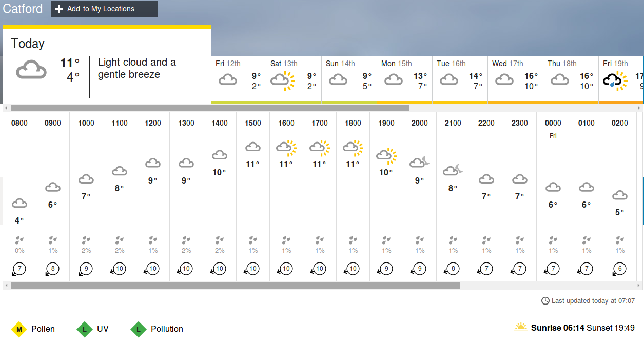 BST The sunshine I wrote about yesterday morning was nice, but it didn't last long, and finished with a heavy fall of rain sometime mid morning. The rest of the day did include a few more sunny intervals, but not many, and not until later in the afternoon. There were also several more showers in the afternoon, but I don't think any were as heavy as the one on the morning. The highest temperature was just 9° C. ![]() The forecast has been updated since taking the screenshot above. It still says there is a high probability of rain for the next few hours, and the sunny periods have been replaced by light cloud until 3pm when there should be sunny periods for the rest of daylight hours. Earlier on there was some sunshine, but that has dwindled down to hazy sunshine now as the cloud starts to thicken. It doesn't look like it will rain, and indeed the forecast doesn't show rain while still saying there is a 78% chance of rain at 10am. It could almost be warm today, and maybe it almost will be from 3pm. Unfortunately the afternoon high is now thought to be just 12° C instead of the earlier guess of 13°. Tomorrow is predicted to be dry, but there will be light cloud all day long, and no sunshine at all. The highest temperature will probably be just 12° C. Yesterday started fairly well. I had complained of a mild cough in the morning, but it was mild enough to be almost ignorable - at least while I was in the fresh air. The first thing I did once I was washed and dressed, was to go shopping. I specifically wanted a spare shower hose and shower head, but I was also on the look out for smelly candles, and anything else that caught my eye. My first stop was the SAM 99p shop. I was pretty certain they still had shower hoses and heads in there, and they did. I bought one of each, and also half a dozen other bits and pieces. Then I went next door to Poundstretcher, and they were doing a complete kit of shower head and hose for £3.99. It was a more sophisticated three setting shower head, and so I bought one of those too. The also had Bizzy Bee hypoallergenic rubber gloves. They were my favourite for doing hand washing. They seemed to last the longest of any other rubber gloves, but Tesco stopped selling them, and I couldn't find them anywhere. I did finally find some on the internet (Amazon), but I reckon they were meant for somewhere where the people have smaller hands, and the large size felt a bit tight. I checked one of the two pairs bought yesterday, and they seemed a better fit. I hope that are just as robust as they used to be, although Adldi's "Power Force" strong household gloves seem to be about as robust. It did feel sort of good while out shopping, although I did have to cough a few times, and also stop to blow my nose a couple of times. When I got in I started my lunch cooking. It was fish fingers and peas. While they were cooking I tried the new 99p shop shower head and hose. It seemed quite good, maybe very good, but I won't be doing a full test of it until I have finished writing here. Fitting the new bits together hardly needed any effort at all, and as little as that effort was, it was the last physical thing I did all day - except for coughing and breathing ! After lunch I had my afternoon nap. I didn't really have anything else to do, or wanted to do in the couple of hours before I was due to go out for my late Thursday afternoon drink. It might have been due to the sleep, but after I woke up, and got dressed to go out again, I felt cold -shivery cold. It was like I had a mild fever, and from the way I was feeling it probably was a mild fever. It felt like all my energy had gone, and I just wanted to lie down again. On top of that my nose was starting to feel a lot more bunged up. I decided I would call in sick, and stay at home with the heater on full blast until I felt warm again. I can't remember if I had another snooze after that or not, but I know that after an hour of the heater being on full blast I was feeling a little more than warm. I then turned the heat down to half, and remained comfortable for the rest of the evening, and through the night. My nose never got to the point where it was actually dripping, although it seemed to get close to it a few times. My cough didn't really get any worse either, although the cough seemed to be the result of a dry and tickly throat, and it was easy to keep that well lubricated. Having missed drinking beer in the pub I opened up my entire stock of Innis & Gunn session IPA. That was four 330ml cans, or about 2 pints in total - so less than my usual 3 pints on a Thursday evening. By 8pm there was nothing on TV to grab my attention, and I was feeling tired, so I went to bed - initially just to read. By 8.30pm I felt ready to try for sleep. I had some doubts, that turned out to be unfounded, that it would be easy to get to sleep while my nose felt stuffy, and I was occasionally coughing. Perhaps it was because my nose only felt stuffy rather than dripping that it was easy to fall asleep in an interval between coughs. I was soon asleep, and I slept better than I had imagined I would. I made the usual couple of trips to the toilet for a wee, and I was back asleep again in minutes. When finally woke up at 8am. It is sort of strange how your body or part of your mind can so easily override the part of your mind that says go back to sleep again. There is definitely some hidden signal that commands that this time is the time to get up ! So I got up ! At that time my nose felt mildly stuffy, but nowhere near blocked, and I wasn't coughing much at all - particularly after a quick drink. Although I wasn't actually coughing, my throat felt constricted, and my breathing was a little bit noisy (or so I imagined). It was time for a couple squirts from my precious can of Salbutamol asthma inhaler. Now I remember it, I had a couple of squirts before going to bed as well. It performed it's usual trick of opening up the airways, and allowing me to do a