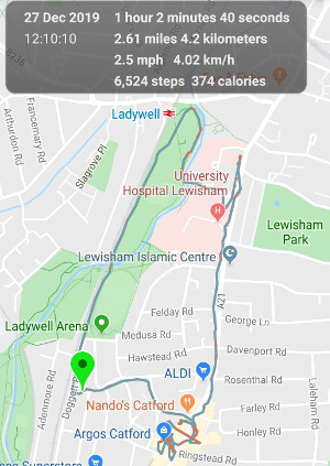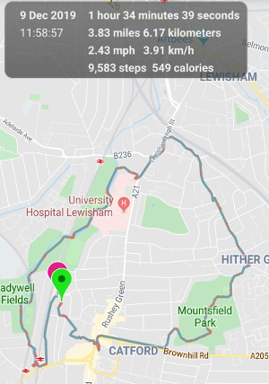 Their turnover of CDs seems to be quite quick at the moment, and I found another 5 CDs that interested me (at 99p each). Blondie, Chris Rea, Carly Simon, and Joe Jackson are all known quantities, but I took a chance on a Smashing Pumpkins double CD. I don't really know if I like Smashing Pumpkins or not. I certainly don't recognise any song titles, but the name of the CD, "Mellon Collie & The Infinite Sadness" somehow seems familiar. Maybe I read about it in a music magazine many years ago, but if I did I can't recall a single thing I read. The two cameras I didn't even look at the last time I was in the shop were still there, and this time I thought I would take a look. Both looked nasty and plasticky, but one had a flash gun attached to it by a bracket that included a hand grip. I thought that might be useful even if the plastic (film) camera wasn't worth bothering with. Another bonus was that it came with a small camera case that could be quite useful. Unfortunately someone had left the batteries in the flash gun, and they had leaked. It has rotted away the battery contact, but if the circuit board inside is not too badly damaged it could be repairable if I could find the patience to do it. The other camera was more interesting. It was a Toshiba digital camera. It must be quite old, and is only 3.2mp, but if it is as good as the nearest contemporary camera I have to it, my Olympus C100, which is only a 1.3mp camera, it could be quite usable. I did take a couple of indoor test shots, and considering it has not been set up in any way, the results seemed OK. The bad thing is that like my Olympus C100 camera, it uses a Smart Media memory card, and they are now very rare. It was a memory card format that never caught on. I found a couple of second hand cards on Amazon, and ordered them. They are a bit expensive compared to SD memory cards - incredibly so when you compare them price-per-byte. I think the biggest Smart Media cards were only 128MB. I routinely buy 32GB cards for my big cameras. ![]() All this shopping, and playing with cameras meant I was too late to go for a long walk, and barely had time to get to the pub by the shortest walk possible. It was still worth trying, and I think I surprised myself by walking direct from home to the pub in just 11 minutes. When I put the tracking app on pause I noted that my average speed had been 3.3mph - a bit faster than when I am stopping to take photos along the way, and maybe very slightly higher than my usual walking pace. Walking pace is often quoted at 5mph, but very people reach that by my observation, and even fewer manage to sustain it for long. I felt quite pleased with my performance. I had no idea if Angela would turn up at the pub or not. She didn't know I would be there, and we had had no contact since before the weekend. I was in the pub a good 5 minutes before 1pm (much to my surprise), and I was well into my first pint of Guinness when Angela arrived at about 10 past 1pm. She was surprised, but happy to see me. We had a good chat together, but I really can't remember just what most of it was about. That didn't really matter because it was warm and friendly, and I do remember there was smiling involved. I guess it was just all inconsequential small talk - the sort of thing I didn't think I could do, but it seems easy with Angela. I guess being the same age, having broadly similar music tastes, and both living in or near Catford all our lives, gives us so much in common. One thing I do recall was Angela telling me how my weight loss was beginning to show. That felt nice, and gave me inspiration to carry on. As usual we left the pub together, and I walked Angela back to work. We parted with another very warm hug with smiles all around. The walk back to Angela's work was a bit slower than my walk to the pub, and I picked up the pace again once I had said goodbye. Even at a fairly hard pace to catch up a bit of time, I became aware of just how cold it was feeling. I am not sure why I noticed it less when out shopping, or going to the pub. During the afternoon I felt really cold, and turned the heater up full to compensate. What I should have done was to have a hot soup or two, but instead I ended up snacking on all sorts of things - both bad and not so bad. The main consequence of this was that my blood glucose level was higher than than my current average when I checked it before having my dinner at 6pm. At least my dinner was designed to be healthy (I hope). Like the day before it was a pile of salad stuff with grilled chicken on it. On this occasion I used skinless/boneless chicken thighs, and before grilling them I poured some extra hot chilli sauce on them. It gave them a bit of a tang, but I am sure I could do better (and hopefully will tonight). I grilled just three thighs out of a pack of about eight, and so I have more to experiment with. One thing I will do is to give them a bit more time under the grill. They were cooked through properly, but still seemed a bit "wet". Another 10 minutes under the grill would have improved the texture, and should drive off a bit more fat. I was very tempted to snack more in the evening after I had eaten dinner. I don't think I was actually hungry, but feeling cold earlier had invoked some sort of primitive survival instinct in me - possibly ! It is fortunate that I didn't have that much to snack on, but I did get through a lump of cheese, and I even ate two packets of crisps ! I was most surprised to find my blood glucose was almost back to normal this morning, and I didn't seem to have put on any weight, but I am not complacent about these matters. I had a reasonable, not great, but not bad, sleep last night, and I seem to feel generally OK. This morning, and perhaps after no more than wiping a damp flannel across the smellier bits. I intend to go out for a longer, and faster walk. My idea is to see how fast I can walk a complete circuit of the northern part of the park - up to Ladywell 