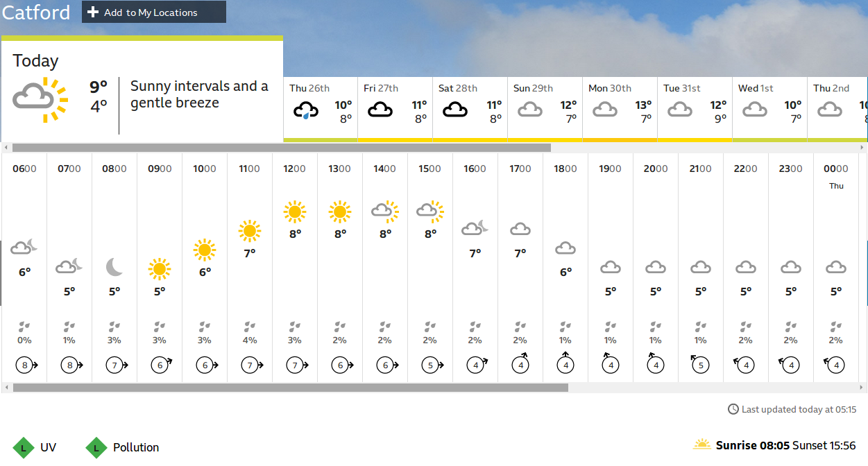 GMT Yesterday didn't turn out quite like the forecast predicted - except the hastily put together revision that reflected reality almost after it happened. The morning was bright and frequently sunny, but just 11° C doesn't feel warm at all in a howling gale ! By midday the wind had dropped, and the clouds thickened. There was no hint it was coming in the morning's forecast, but it then started to rain - and it was almost heavy rain ! The rest of the day was rubbish - dull, sometimes wet, and getting cooler. ![]() According to this forecast