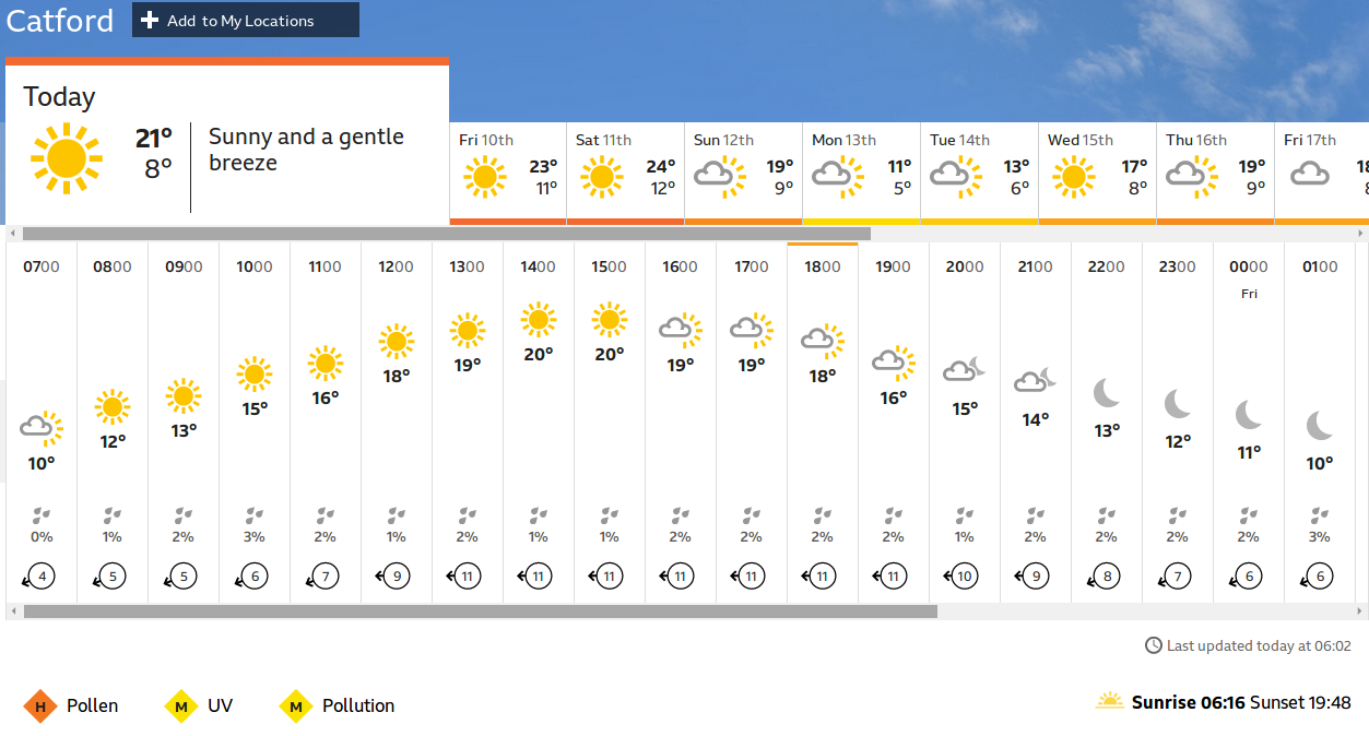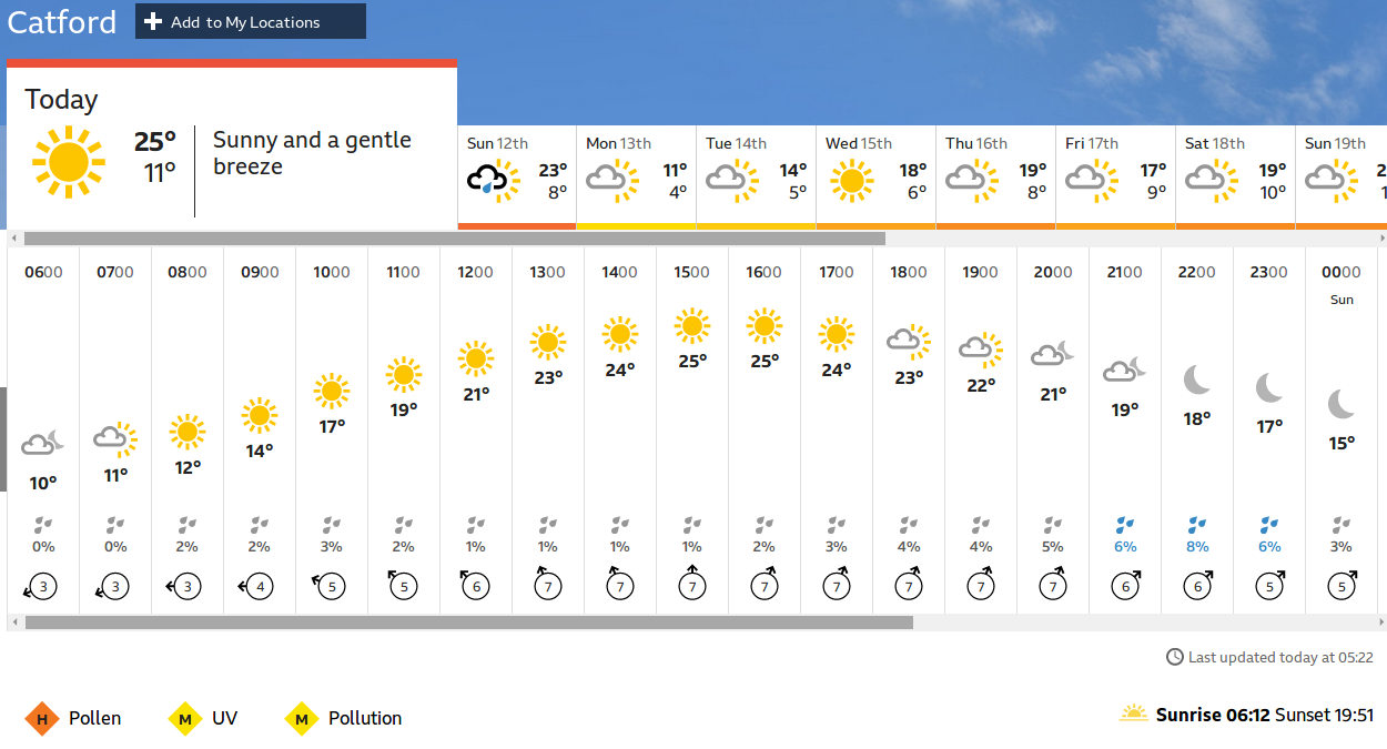 BST Once again the weather turned out to be better than the forecast. There were a few times yesterday when a cloud passed in front of the sun, but I can really only think of yesterday as being a lovely sunny day. It was also a warm day. The temperature rose to 15° C, and maybe I might have seen 16° C. Definitely t-shirt weather ! ![]() Today is forecast to be