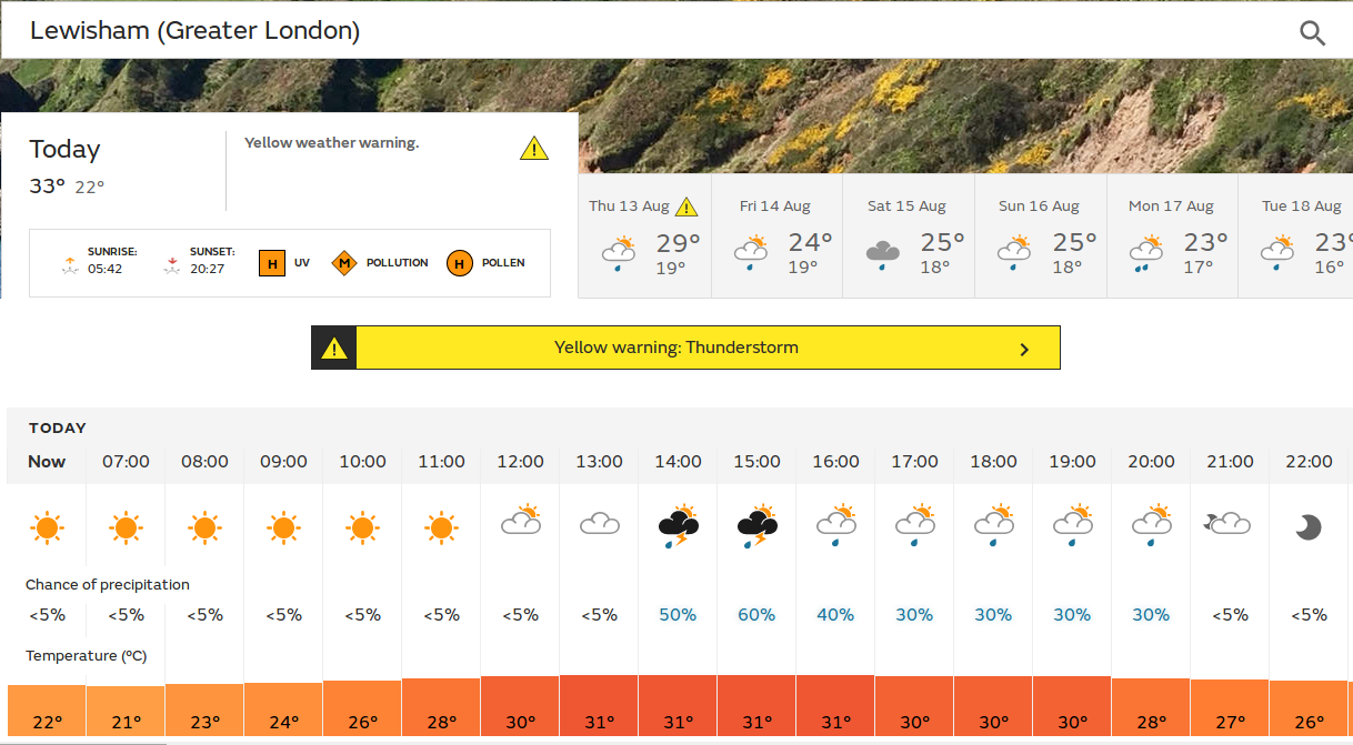 | Lockdown day 138 Shopping embargo day 16 08:02 BST Yesterday can simply be described as hot ! The highest temperature I saw on my thermometer was 33° C. That was a degree less than the forecast, but maybe that was because the sunshine failed after 4pm when clouds started to roll in. It wasn't a complete coverage, and it stayed dry - except for the humidity. With little sunshine heating the front of the house my bedroom temperature dropped from like a furnace down to a mere oven. It was a hot, sweaty night ! ![]() The current prediction for tomorrow is that there won't be full sunshine until about 11am, but then the sun is probably going to blaze down until at least early evening, and the temperature will rise to about 30° C. This coming Monday and Tuesday will also be hot, and possibly very humid to as thunderstorms brew up. Both the Met Office and BBC predict thunderstorms for both Monday and Tuesday. Oh well, at least I won't have to water the garden on those days....probably. The first thing I did