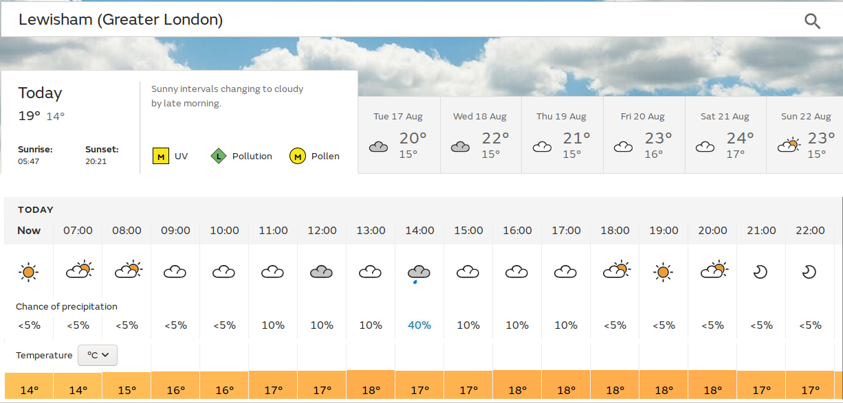 | 10:16 BST It is difficult to describe yesterday's weather in Catford because I wasn't in Catford for a fair chunk of yesterday. During the morning there were a couple of sunny spells, but it was close to gloomy when I went to the station at midday. During the long journey to Herne Bay we passed through a couple of showers. At Herne Bay it was generally pretty dull, but I could see some sunshine on the sea some miles away. It was around 4pm when I thought I felt some very light rain, but it only seemed to last a minute or two. On the train home we, once again, passed through a couple of showers. It was dry when I got back to Catford, and as far as I am aware it stayed dry for the rest of the day. I think the temperature was probably around 19° C both here and in Herne Bay. ![]() The forecast has