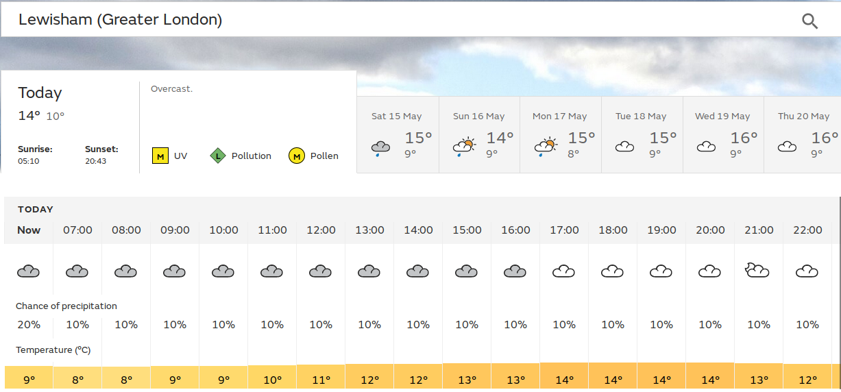 430 08:52 BST The weather forecast suggested it would be a good day to dry clothes on the line yesterday, and then, just as I put some clothes on the line it changed it's mind ! In reality the rain forecast for 2pm, and 4pm didn't happen, but there was a very brief, very light shower at 5.45pm. The morning did feature sunny spells, but the afternoon was mostly cloudy - sometimes very heavy cloud, and sometime the cloud seemed so light that it seemed the sun might break through (it half managed it for a few seconds). The afternoon was not warm, but better than mild or tepid, with an hour or two at 19° C. ![]() The latest revision