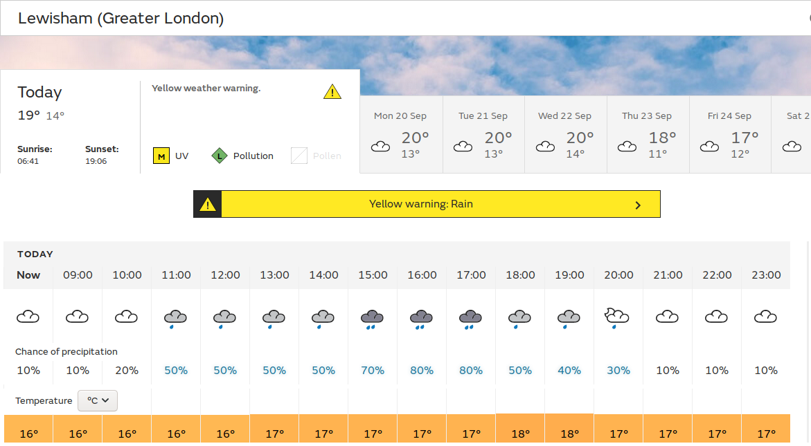 | 10:24 BST I could have just edited the temperature in what I wrote here yesterday, and it would almost describe yesterday's weather. Two changes come to mind. I don't think I was aware of any rain yesterday, and the afternoon temperature probably reached the forecast 19° C because it didn't feel quite so cool (it would still be hard to describe it as warm though). ![]() I thought it would