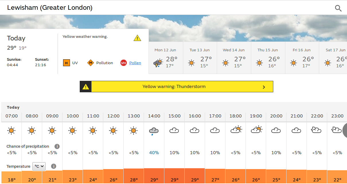 The weather forecast has changed a bit since I took the screenshot above. Everything is the same until late afternoon/early evening when both the BBC and Met Office predict a thunderstorm ! It could happen around 5 or 6pm. Before and after that it should be sunny, or at least sunny spells. The temperature should peak at 27° C. Both the BBC and met Office agree that tomorrow should see 26° C, but the BBC say it will be a very sunny day, while he Met Office say just a scattering of sunny spells through the day. |