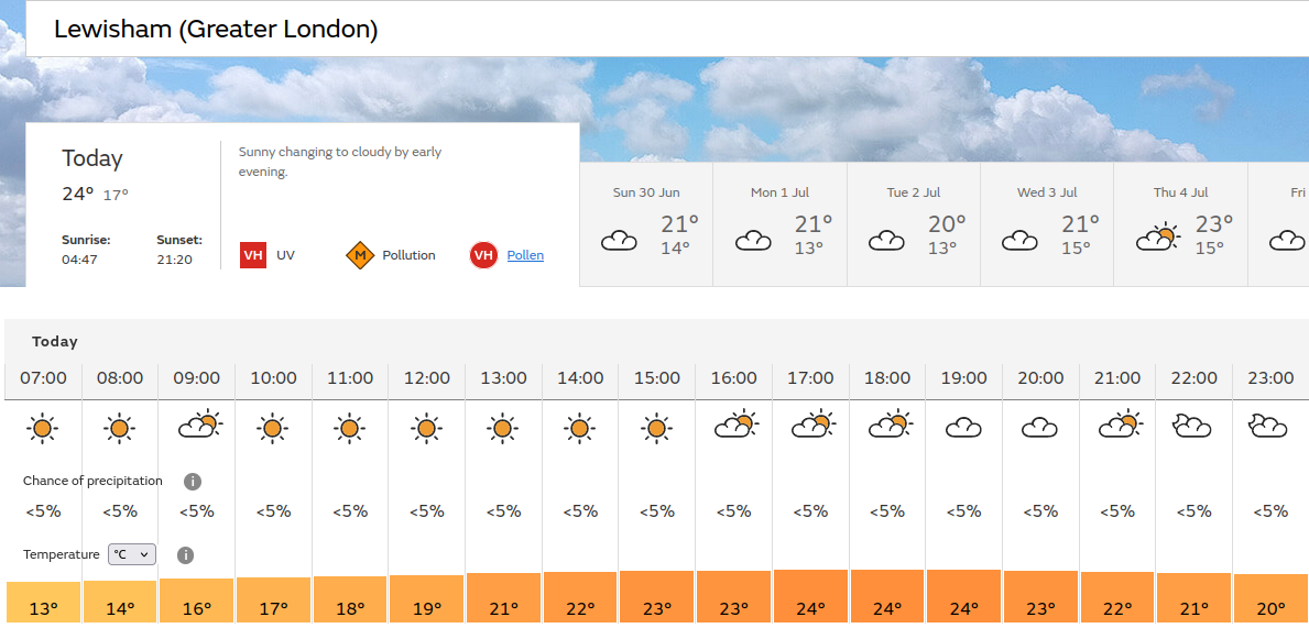 screenshot above. The BBC say a max of only 23° C, but the Met Office think it